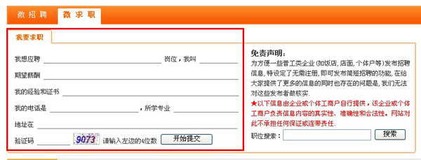 注:在此處填寫招聘信息,填寫成功后點擊“開始提交”,即可發(fā)布成功;等待管理員審核后在微求職頁面就會顯示。