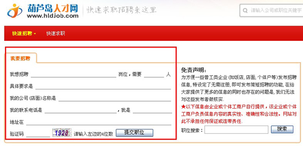 葫蘆島人才網(wǎng)http://m.nbzfbc.cn/為廣大用人單位和求職者搭造一個最佳人才交流平臺,免費注冊發(fā)布不需要您注冊會員,直接就可以填寫您要招聘的職位,實現(xiàn)了方便快捷!下面為您提供免注冊發(fā)布的指南。